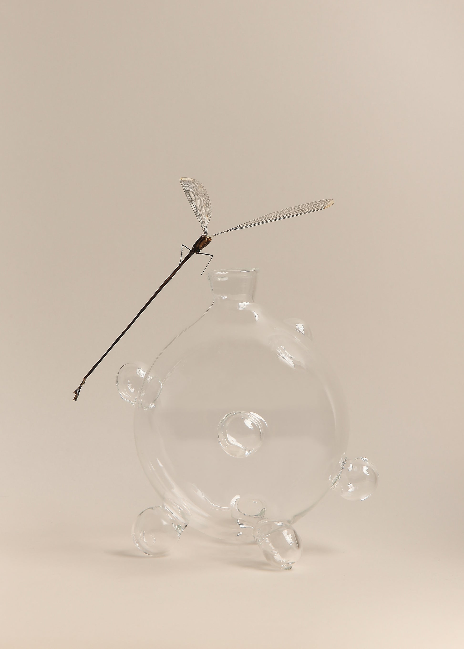 Set de 2 floreros elaborados en vidrio de borosilicato; vidrio soplado, transparente exterior, con detalles de burbujas en relieve.